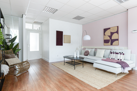 *De gezellige woonkeuken heeft moderne akoestische panelen op de wand.