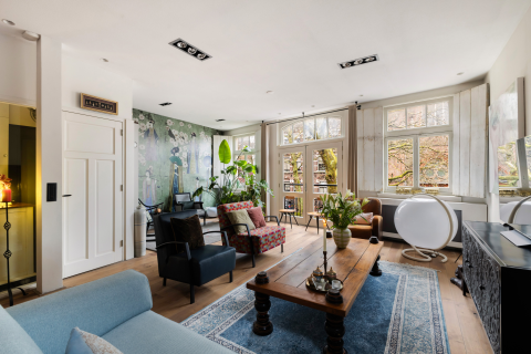 begane grond: entree, ruime hal met garderobe, meterkast en toilet met fontein. Vanuit de hal toegang tot de ruime, L-vormige woonkamer met grote ramen tot op de grond en openslaande deuren naar de achtertuin. Luxe, moderne woonkeuken met kookeiland voorzien van een inductie kookplaat met afzuigkap, veel bergruimte en diverse inbouwapparatuur, waaronder een grote koelkast en vriezer, 2 combi-magnetrons, een vaatwasser en een rvs spoelbak met Quooker-kraan. De keuken heeft openslaande deuren naar de voortuin en zicht op de Breevaart.