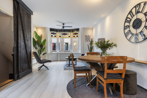 2e verdieping: overloop met zijraam en een luik met vlizotrap naar de vliering. Heel fijne, grote slaapkamer met hoge nok, dakkapellen aan voor- en achterzijde en de mogelijkheid tot het realiseren van twee kamers. Tweede badkamer met een douchecabine, wastafel met meubel, toilet en dakkapel. Aparte cv-/bergruimte met de unit van de mechanische ventilatie en omvormer voor de zonnepanelen.